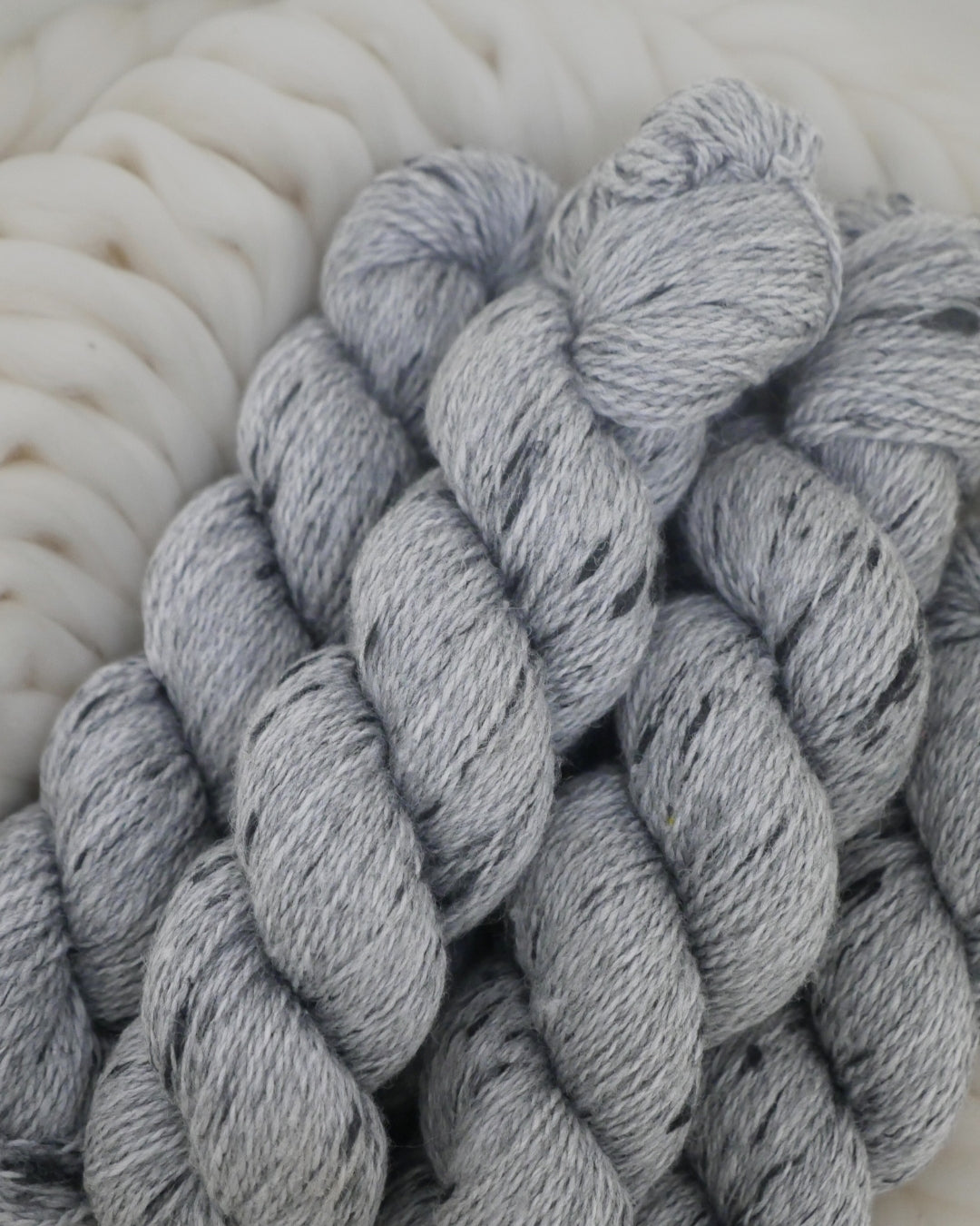 We collect all of our dyed yarn waste from the factory, shred it and blend it with natural ecru wool. This results in a steely grey yarn with distinctive darker flecks for a textured tweed-like appearance. And whilst this medium-tone base proved unsuitable for our hand dyers, it crafts beautiful handknit homewares, garments and accessories.