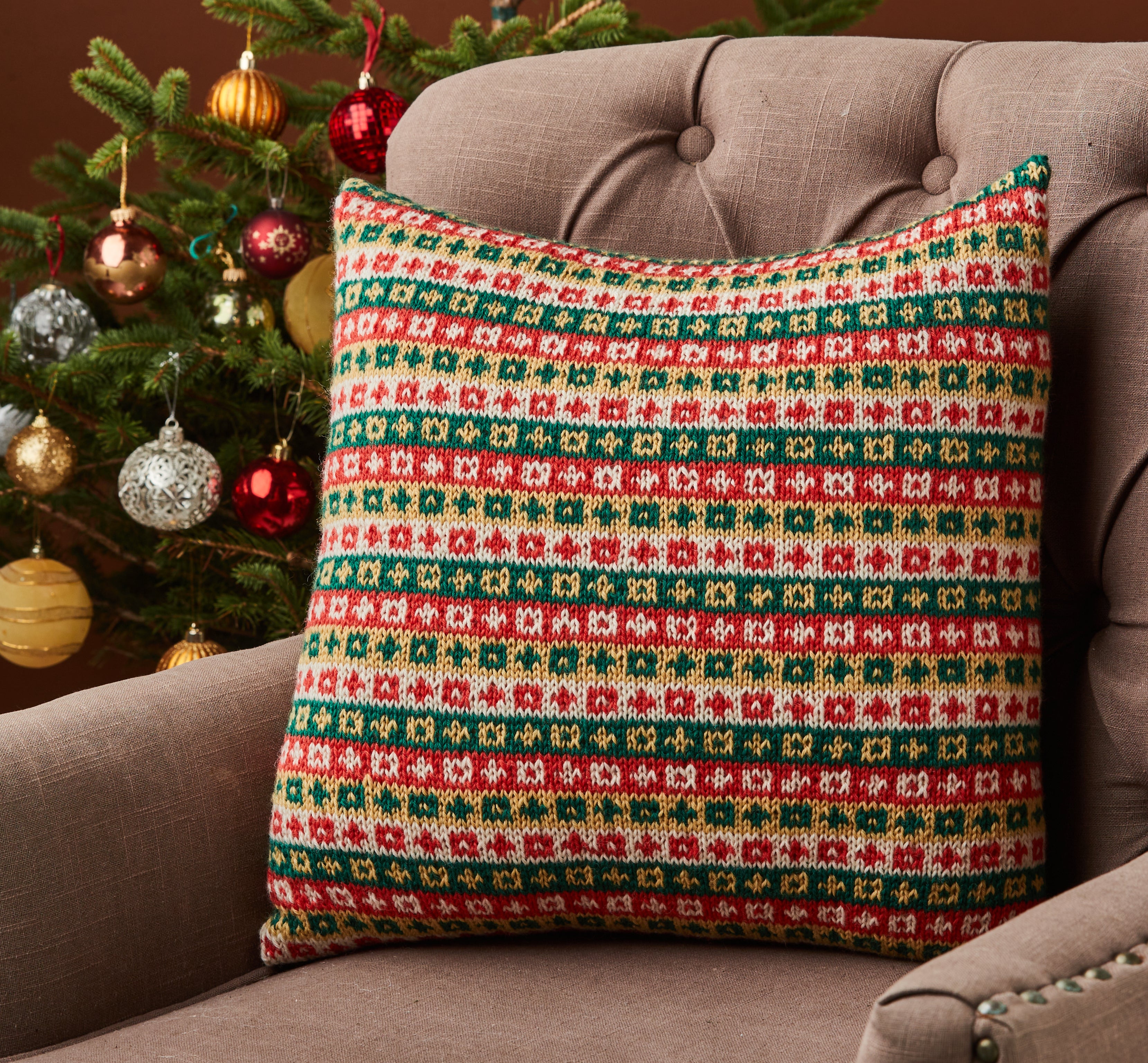 This pattern is suitable for a knitter who has some experience with Fairisle knitting charts and knitting in the round. The cushion cover is knit in a tube and the ends are closed by grafting. You can also sew them together or use your own preferred method such as a three needle bind off.